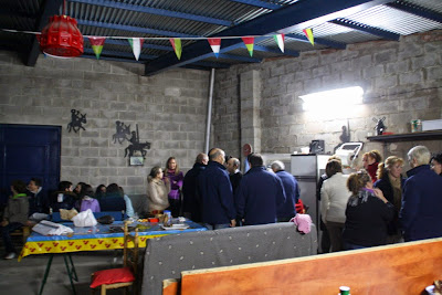y estuvimos toda la tarde de cháchara hasta que llegó la noche.... volvimos a sacar las mesas, tomamos un bocado, y después noche de fiesta, todos con falda que era el tema de la fiesta,